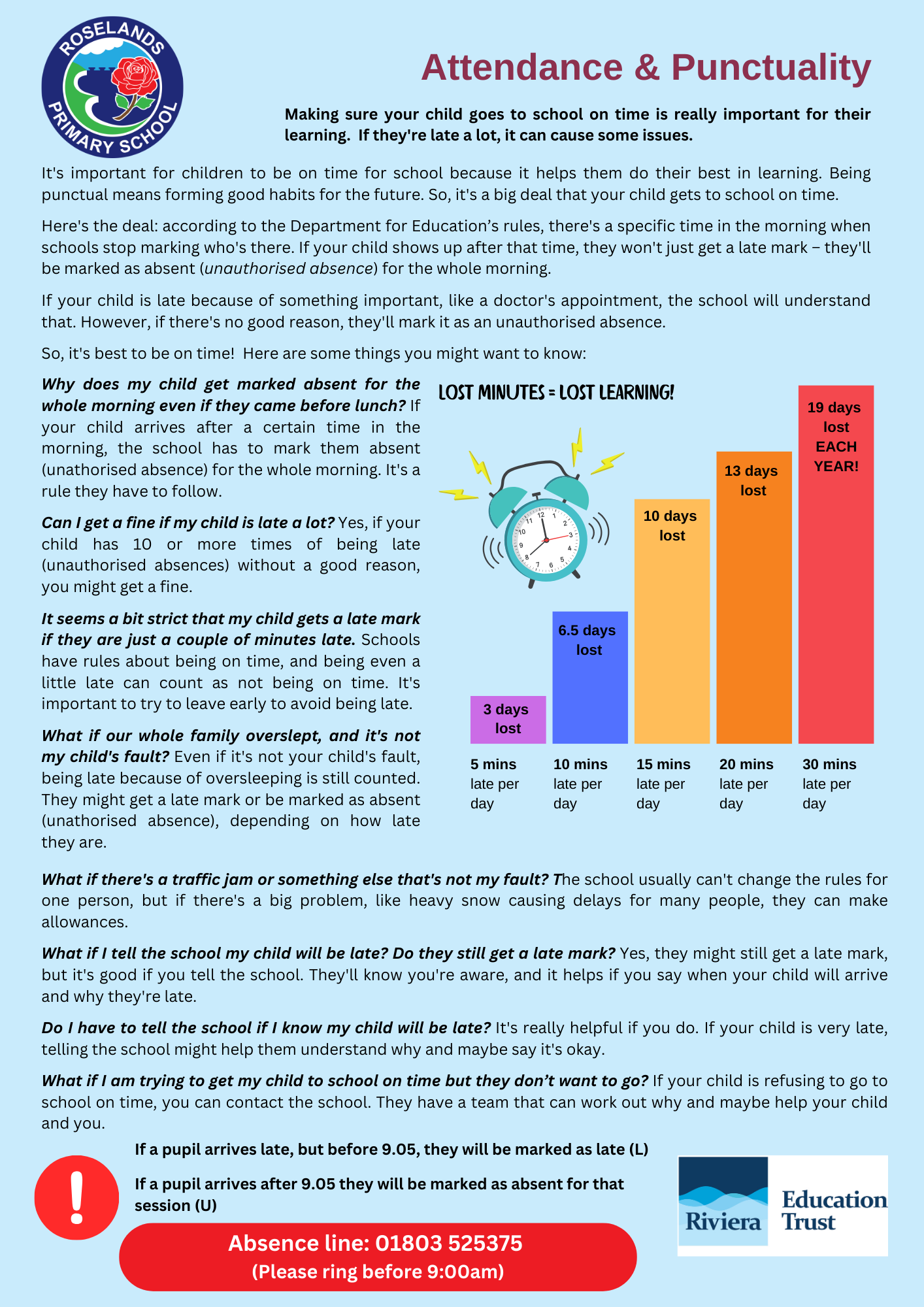 If your child is 5 minutes late every day, they will miss 3 days of learning a year.